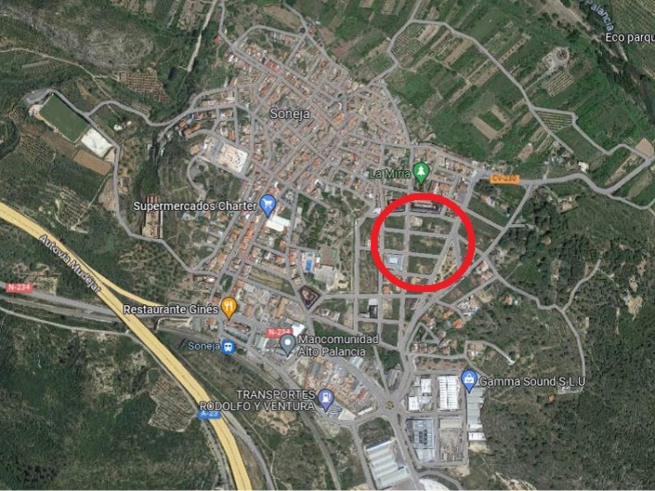 Suelo urbano residencial en Soneja, en zona residencial con todo tipo de servicios cercanos, bien comunicada, junto a la A-23 y a 5 min. de Segorbe y a 15 min. de Sagunto. Cuenta con 1.945 m2 de suelo con fachada a tres calles y una edificabilidad máxima de 3.447 m2 de techo. Tipología: Unifamiliar adosada y/o residencial plurifamiliar. Número alturas: B+I. Número viviendas: 16 Ud. Unifamiliar adosada ò 32 Ud. Residencial plurifamiliar. Oportunidad.